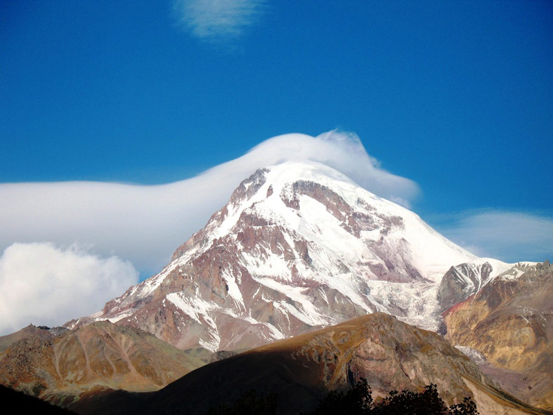 Mount Kazbek is a dormant stratovolcano and one of the chief mountains of the Caucasus located in Georgia,dominating the town of Stepantsminda. It is the third highest mountain in Georgia (after Mount Shkhara and Janga) and the seventh highest peak in the Caucasus Mountains. The name in Georgian, Mkinvartsveri, translates to "glacier" or "Ice Mountain". The Vainakh name Bashlam translated as Molten Mount.