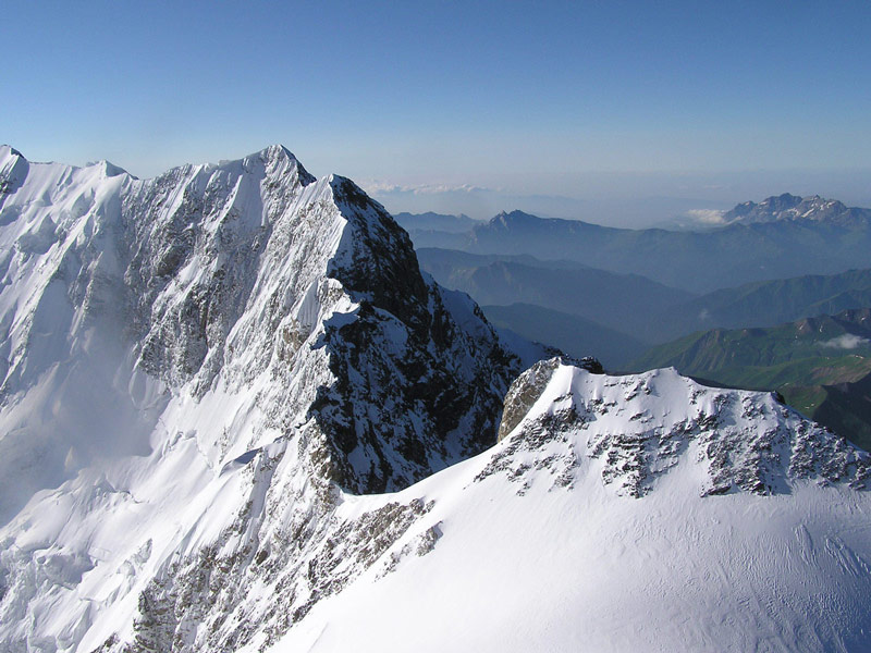 Shkhara is the high point and the eastern anchor of a massif known as the Bezingi (or Bezengi) Wall, a 12 kilometres (7 mi) long ridge. It is a large, steep peak in a heavily glaciated region, and presents serious challenges to mountaineers. Its North Face (on the Russian side) is 1,500 metres (4,900 ft) high and contains several classic difficult routes. The significant subsummit Shkhara West, 5,068 m (16,627 ft), is a climbing objective in its own right, and a traverse of the entire Bezingi Wall is considered "Europe's longest, most arduous, and most committing expedition."