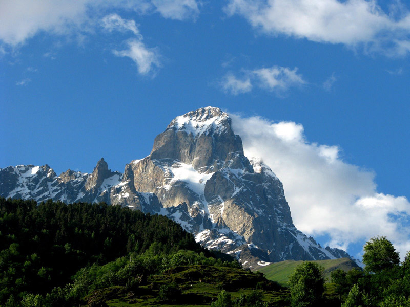 Shota Rustaveli (officially known as the Shota Rustaveli Peak) is a mountain in the central part of the Greater Caucasus Mountain Range, straddling the border of Svaneti (Georgia) and Kabardino-Balkaria (Russia). The elevation of the mountain is 4,860 meters (15,940 ft.). Shota Rustaveli is generally considered to be the 9th highest peak of the Caucasus. The slopes of the mountain are glaciated and some of the glaciers descend well into the adjacent valleys.